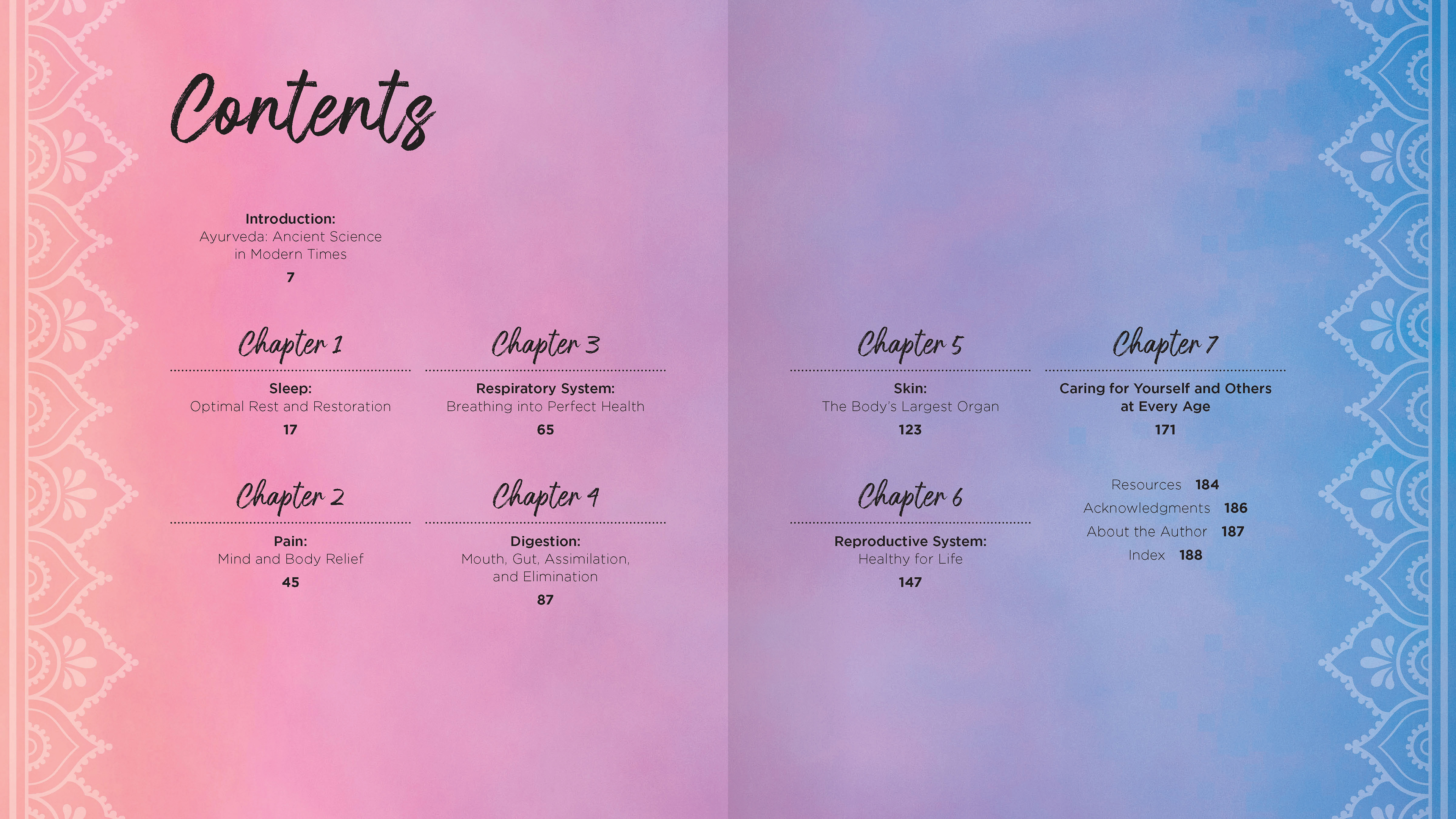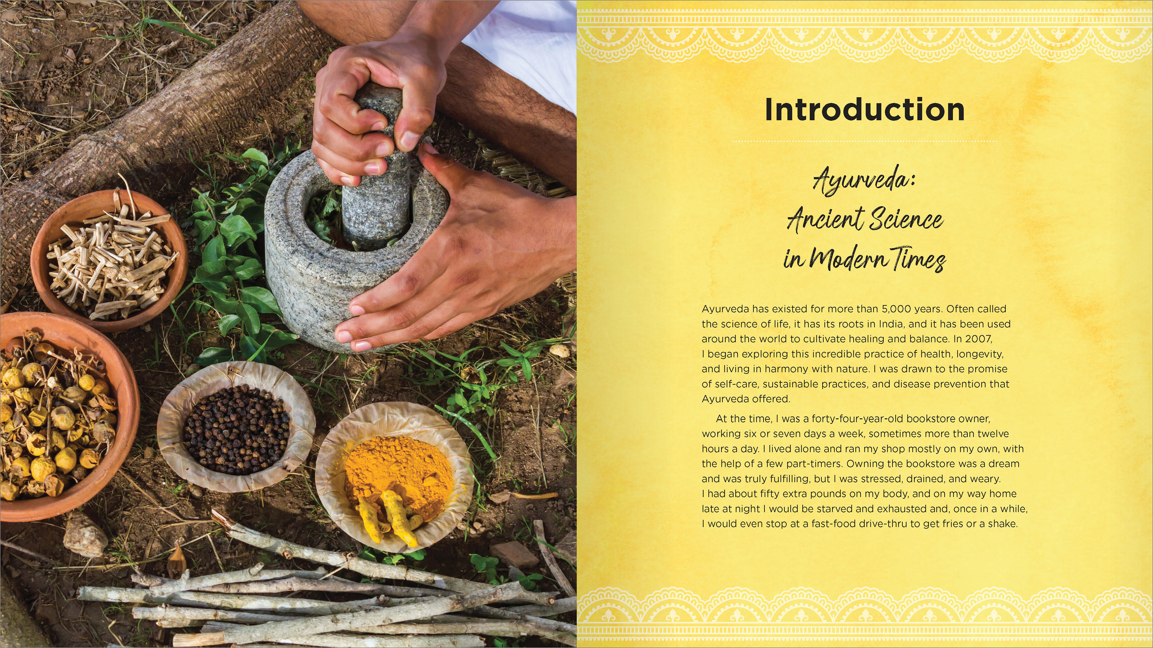 The rich colors and intricate patterns used throughout the design and art touch upon the Indian roots of Ayurveda, a holistic and ancient system of alternative medicine.