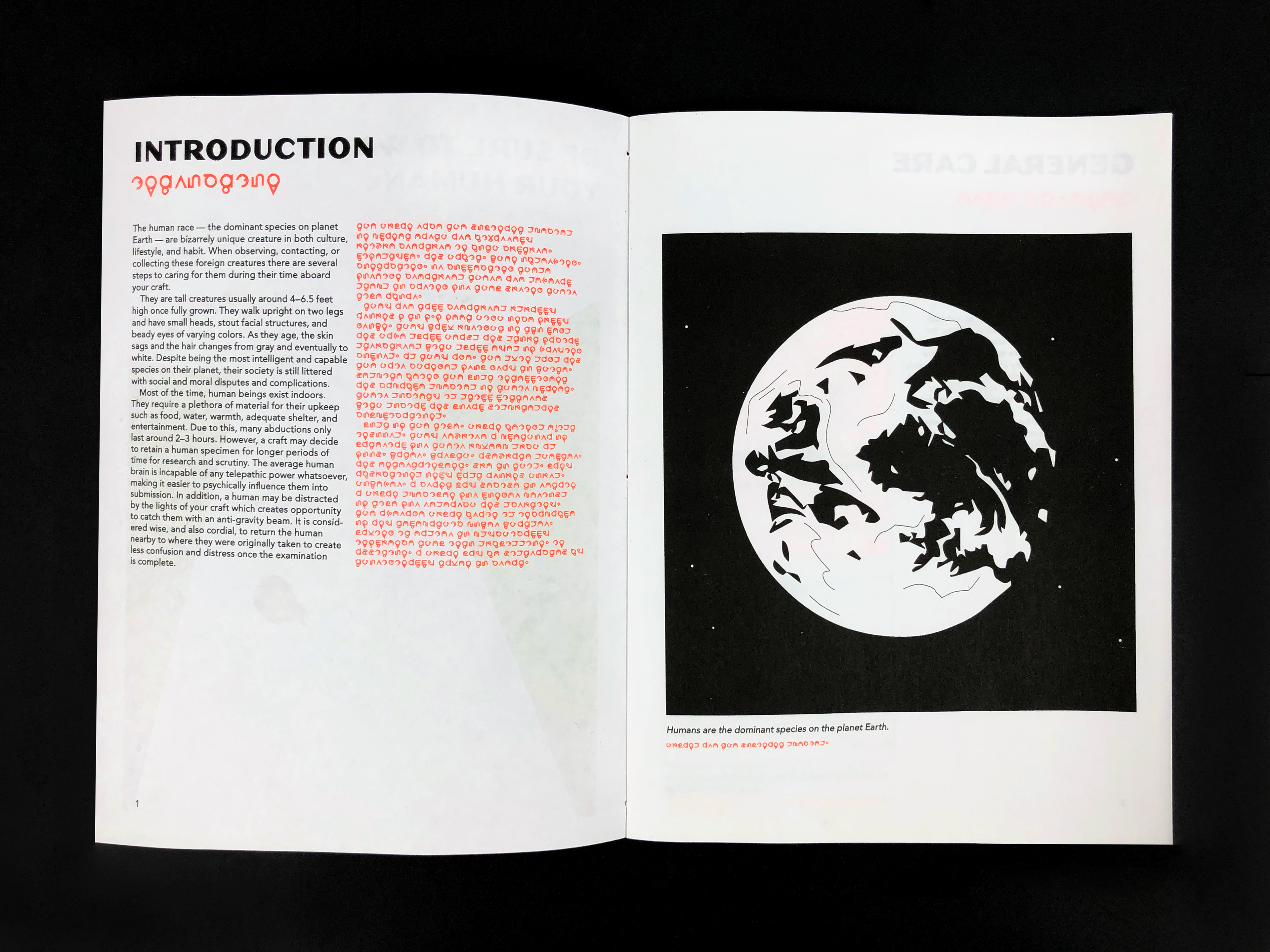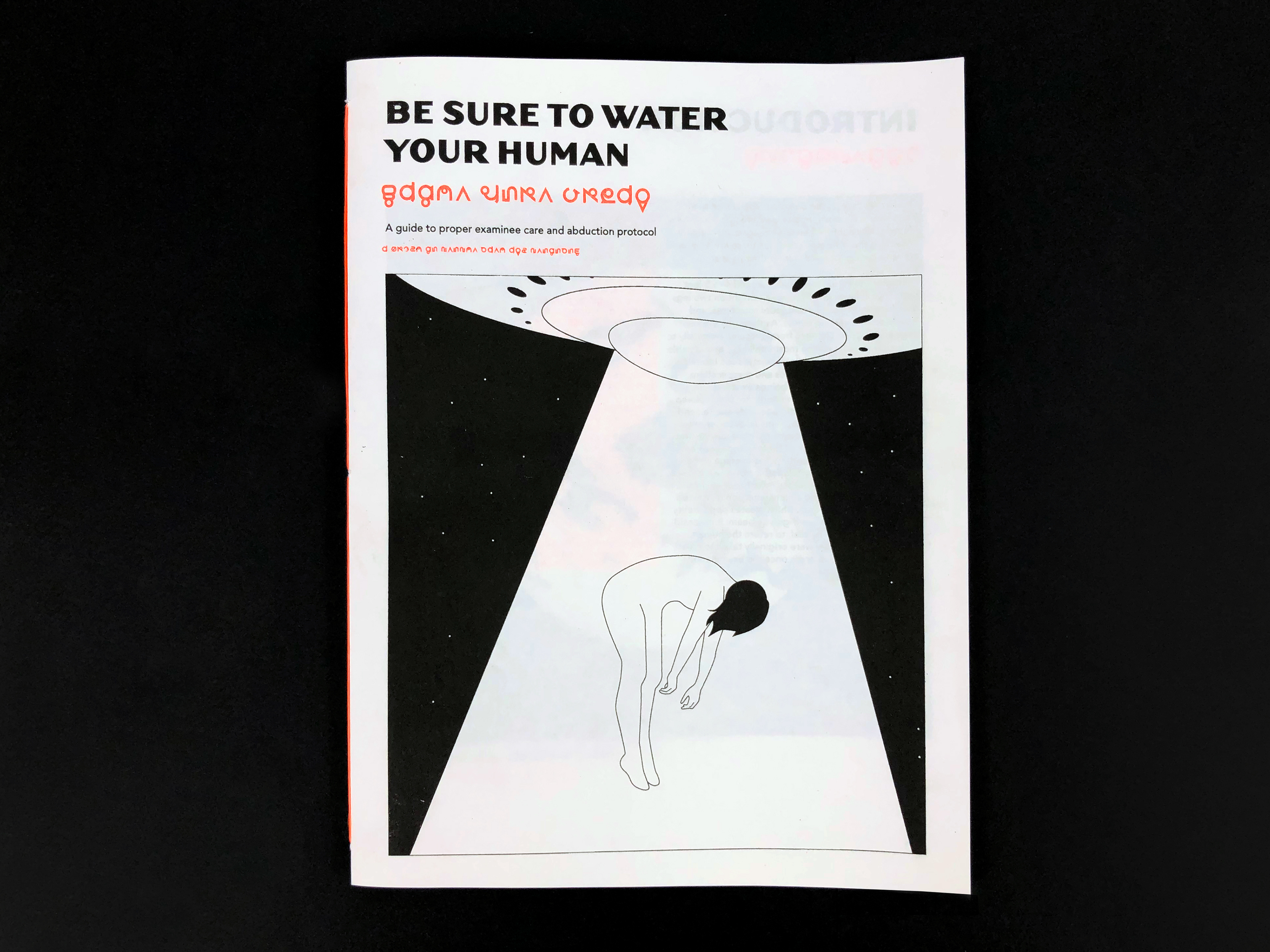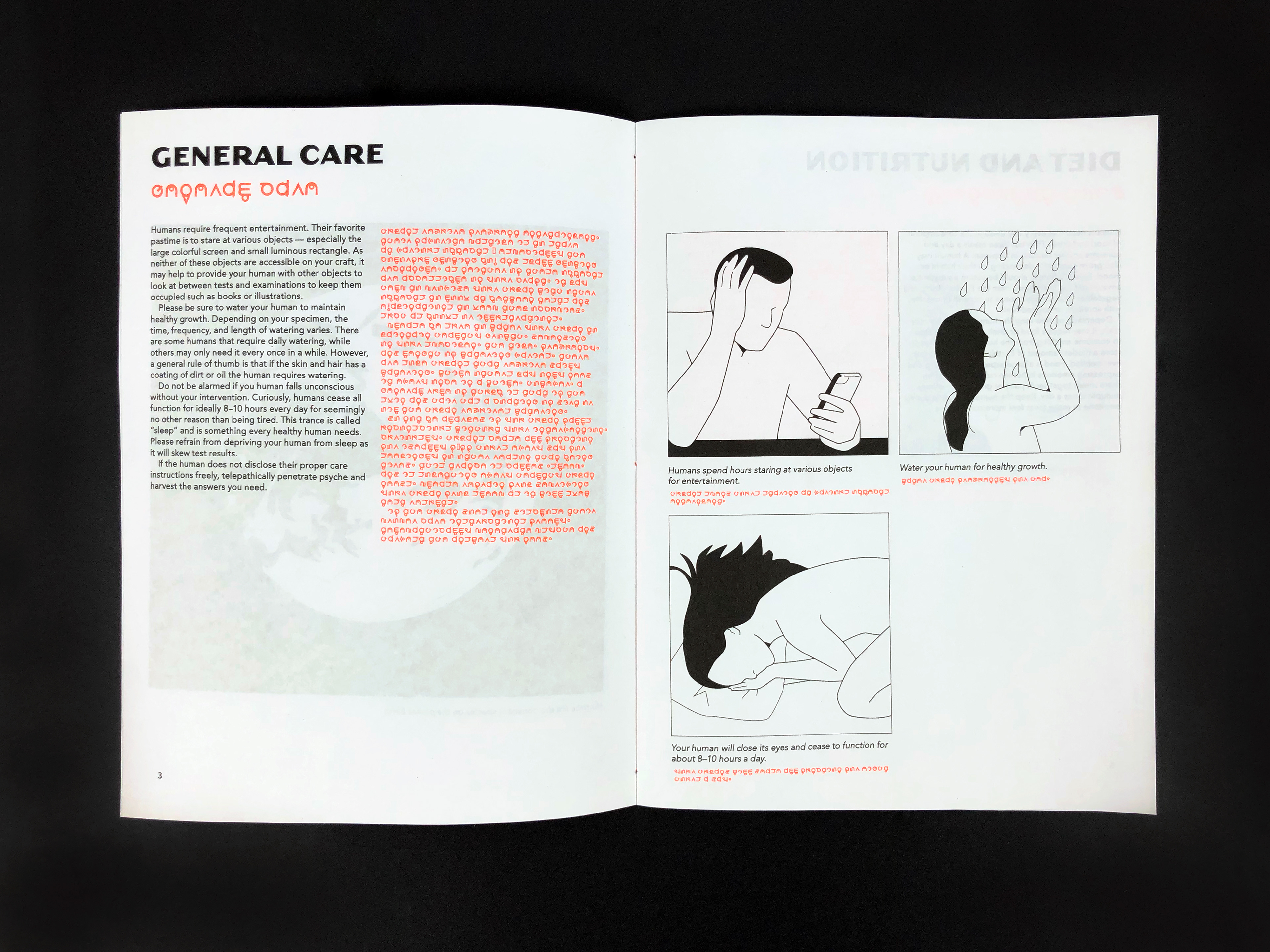 A risograph printed instructional manual that helps aliens provide proper care to abducted humans.