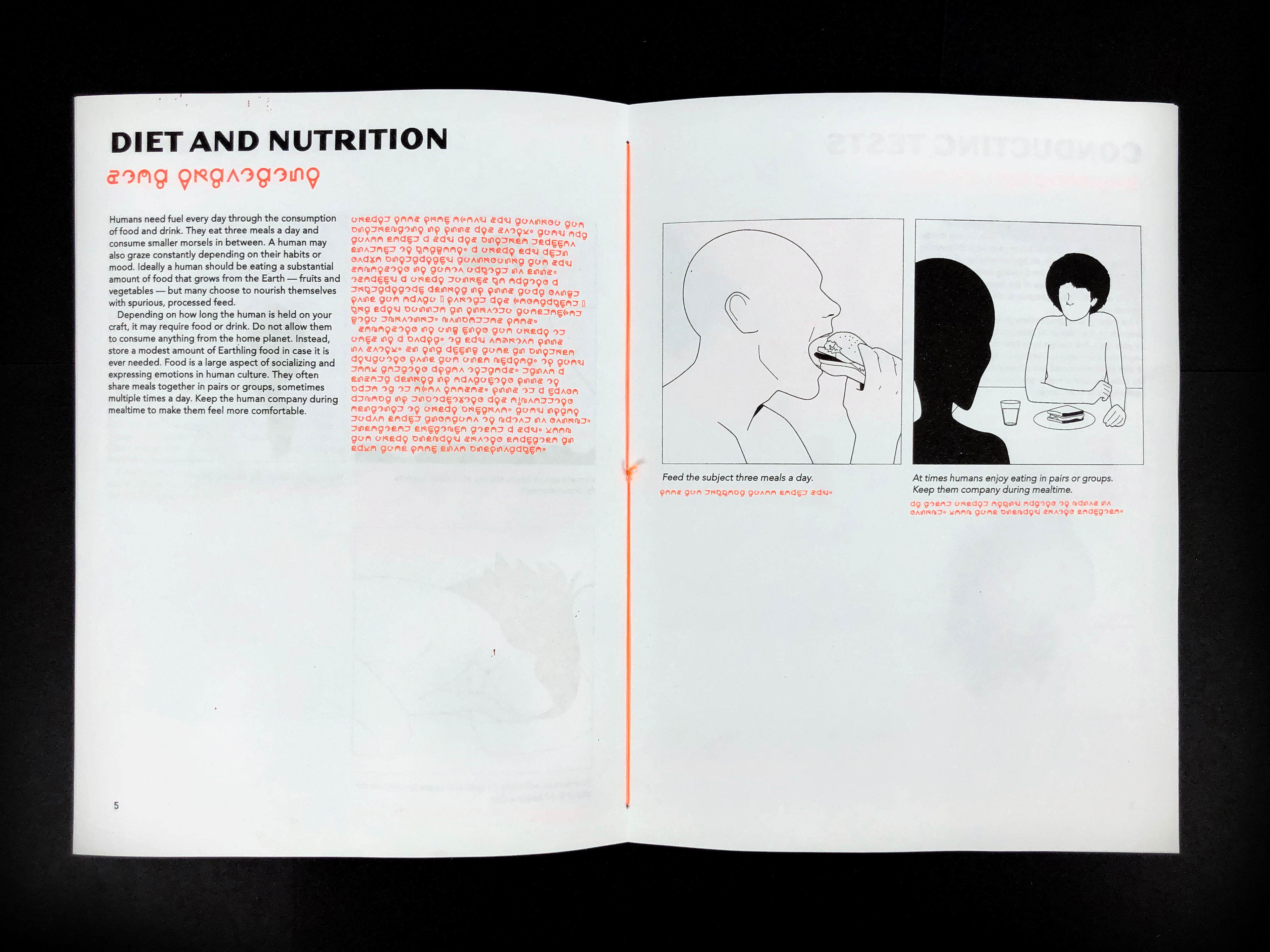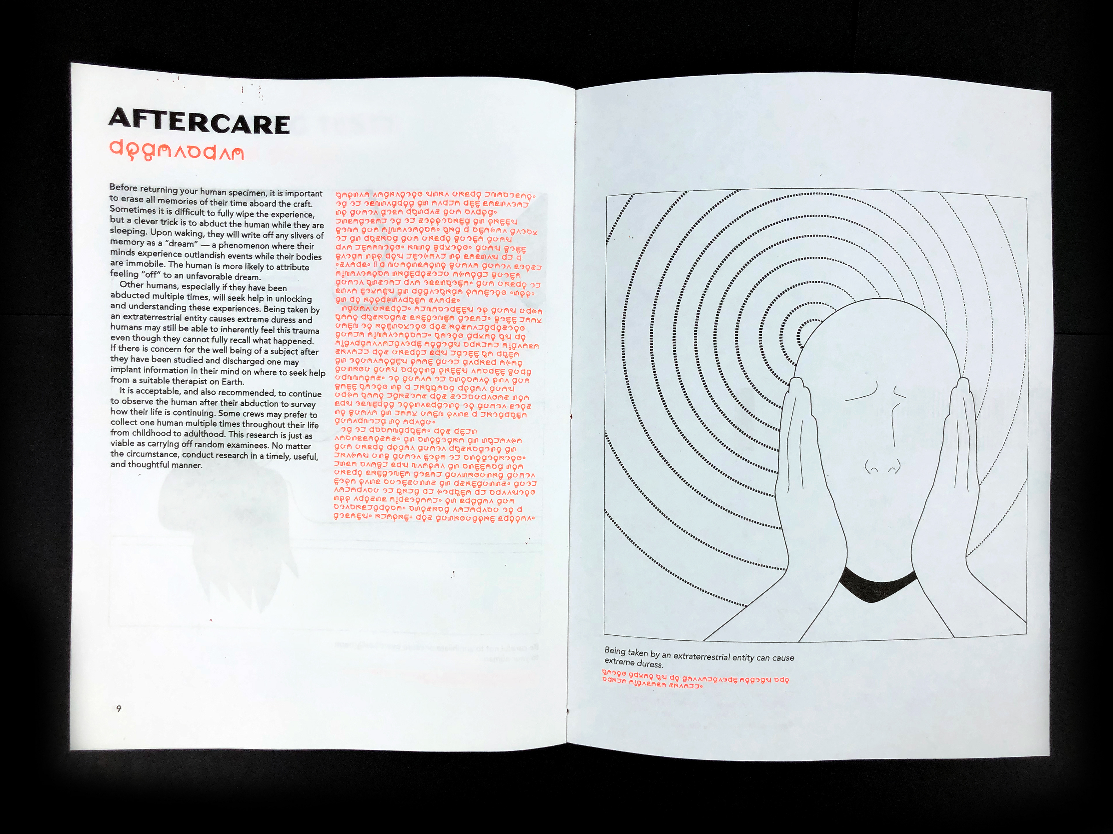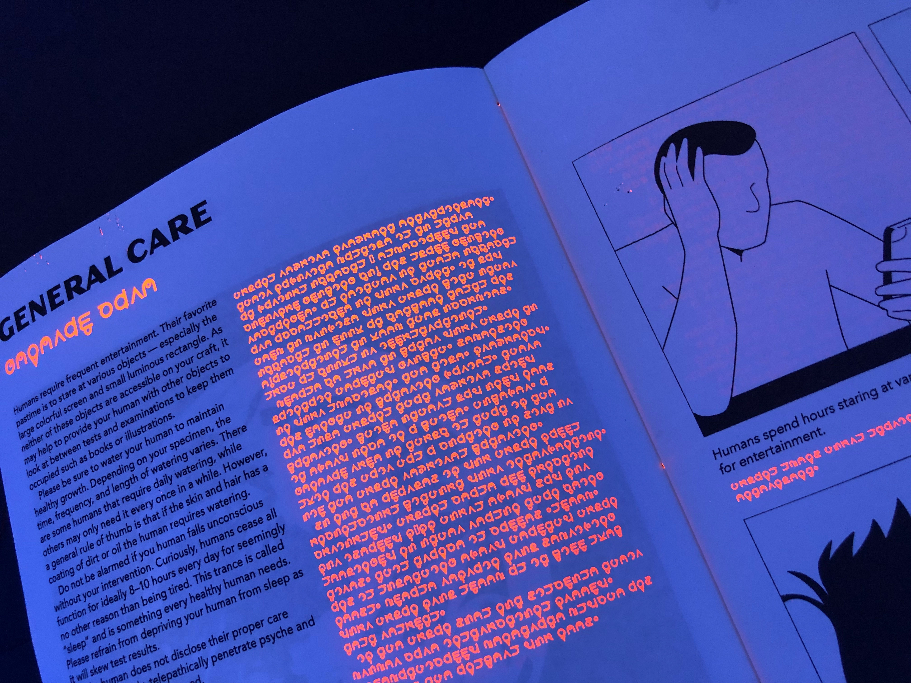 A risograph printed instructional manual that helps aliens provide proper care to abducted humans.